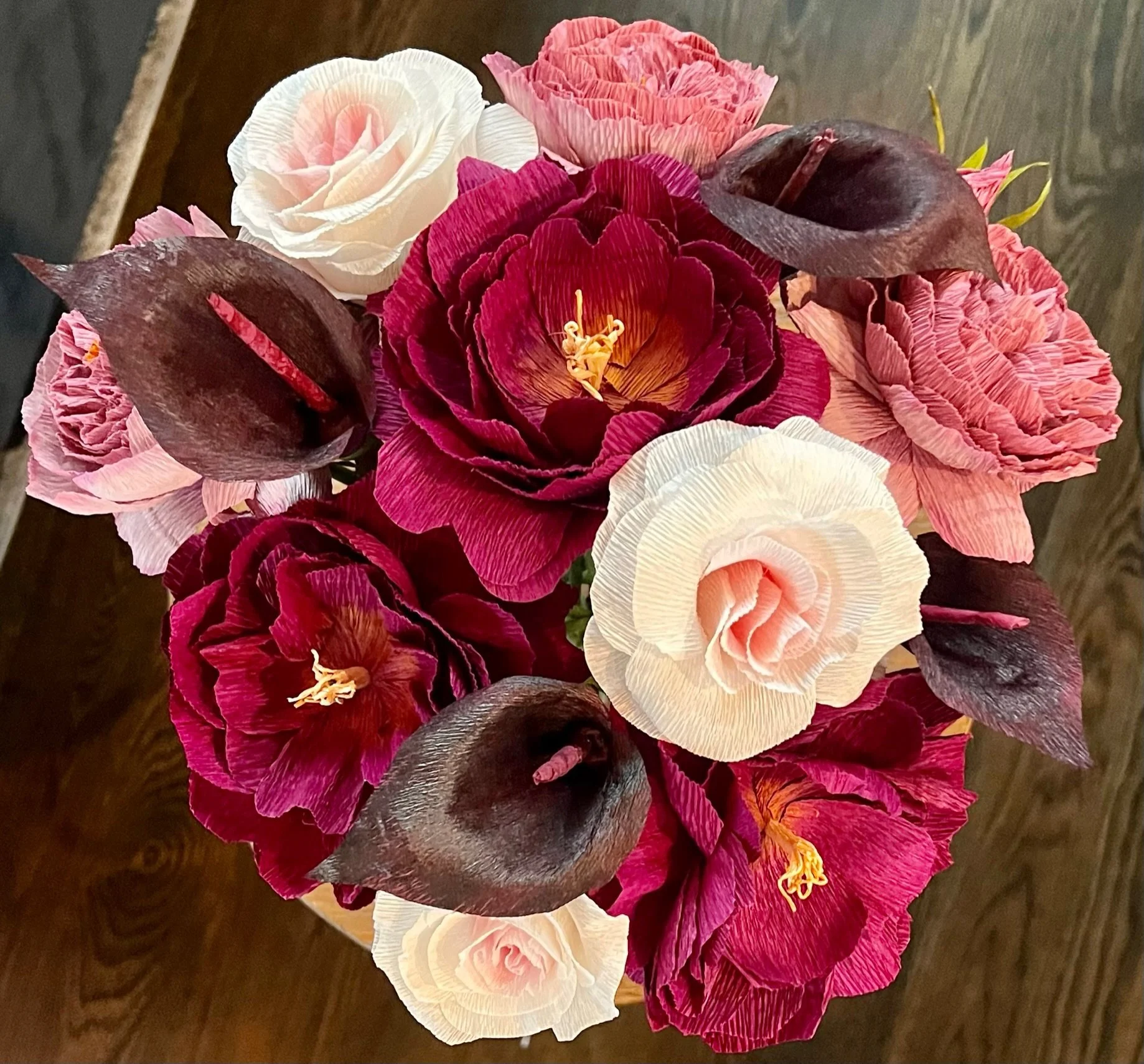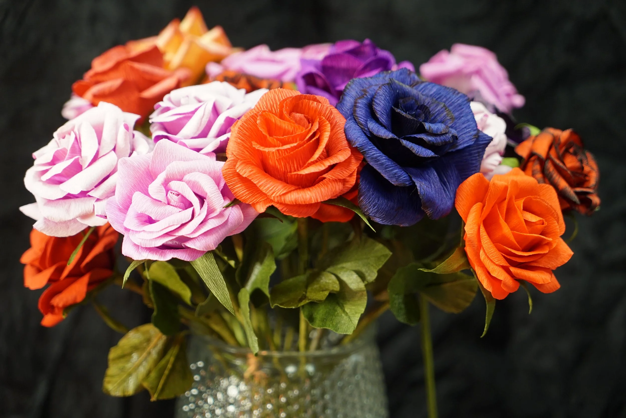 These handmade crepe paper flowers are crafted individually per order. You will notice the time and attention to detail put into every piece. They are made to brighten up any space, anniversaries, special events, holidays, weddings, or simple decor. These flowers do no require any maintenance like sunlight or water and they last a lifetime. Give the gift that will last for years to come!
